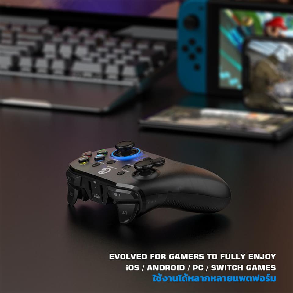 จอยเกมไร้สายรุ่นพัฒนาล่าสุด ถูกออกแบบให้ใช้เล่นเกมได้ทั้งบน Smartphone ระบบ iOS/Android( iOS เฉพาะเกมที่รองรับระบบ MFI เท่านั้น), คอมพิวเตอร์ PC, เครื่องเล่นเกมยอดฮิต Nintendo Switch รองรับไจโลด้วย 6 แกนเซ็นเซอร์ แม่นยำ พร้อมทั้งยังสนับสนุน Apple Arcade และ MFI Game จากทาง Apple เพิ่มปุ่มพิเศษ 4 ปุ่มตั้งค่าได้อิสระ พร้อมระบบสั่นสะเทือนด้วยมอเตอร์ ASYMMETRIC เพิ่มอรรถรสในการเล่นเกมที่้สมจริงยิ่งขึ้น และมีแสงไฟที่โดดเด่นสวยงามอันเป็นเอกลักษณ์เฉพาะตัว แบตเตอรี่อึด 600 MAH ใช้งานได้ตลอดวันและยังสามารถต่อสายเล่นเกมไปในขณะชาร์จ ด้วย USB Type-C ที่มีความรวดเร็วในการชาร์จและรับส่งข้อมูลได้อย่างสเถียรแม่นยำ